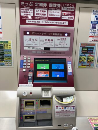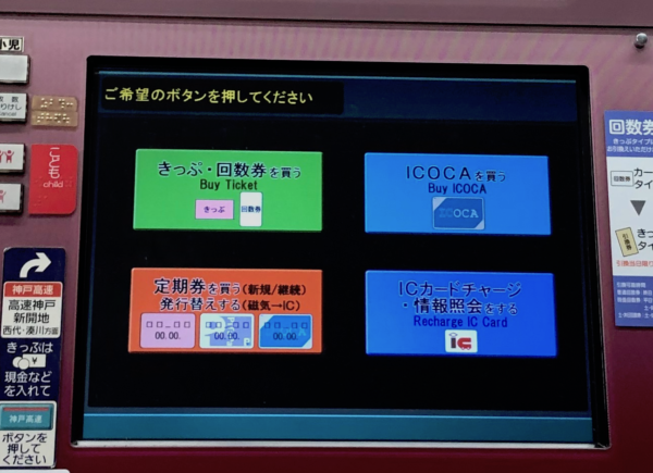 ① If you are buying an ICOCA, press the top right button within the touch panel. Select 2000 yen and insert 2000 yen button. Your ICOCA has a deposit of 500 yen included and so it has the value of 1500 yen. (You can get the deposit back if you return the card empty.) For cancellation, press the red button with とりけし.