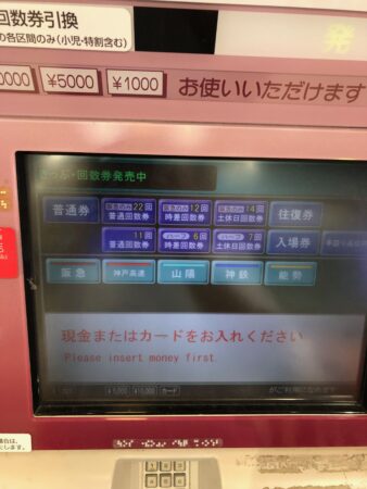③ If you are buying a physical ticket, press the top left button within the touch panel. You see the window shown on the left below. Insert coins or a bill. You can select a ticket (shown on the right below). If you are buying a normal Hankyu ticket, ignore all the buttons on the upper half of the panel and just press an appropriate fare button.